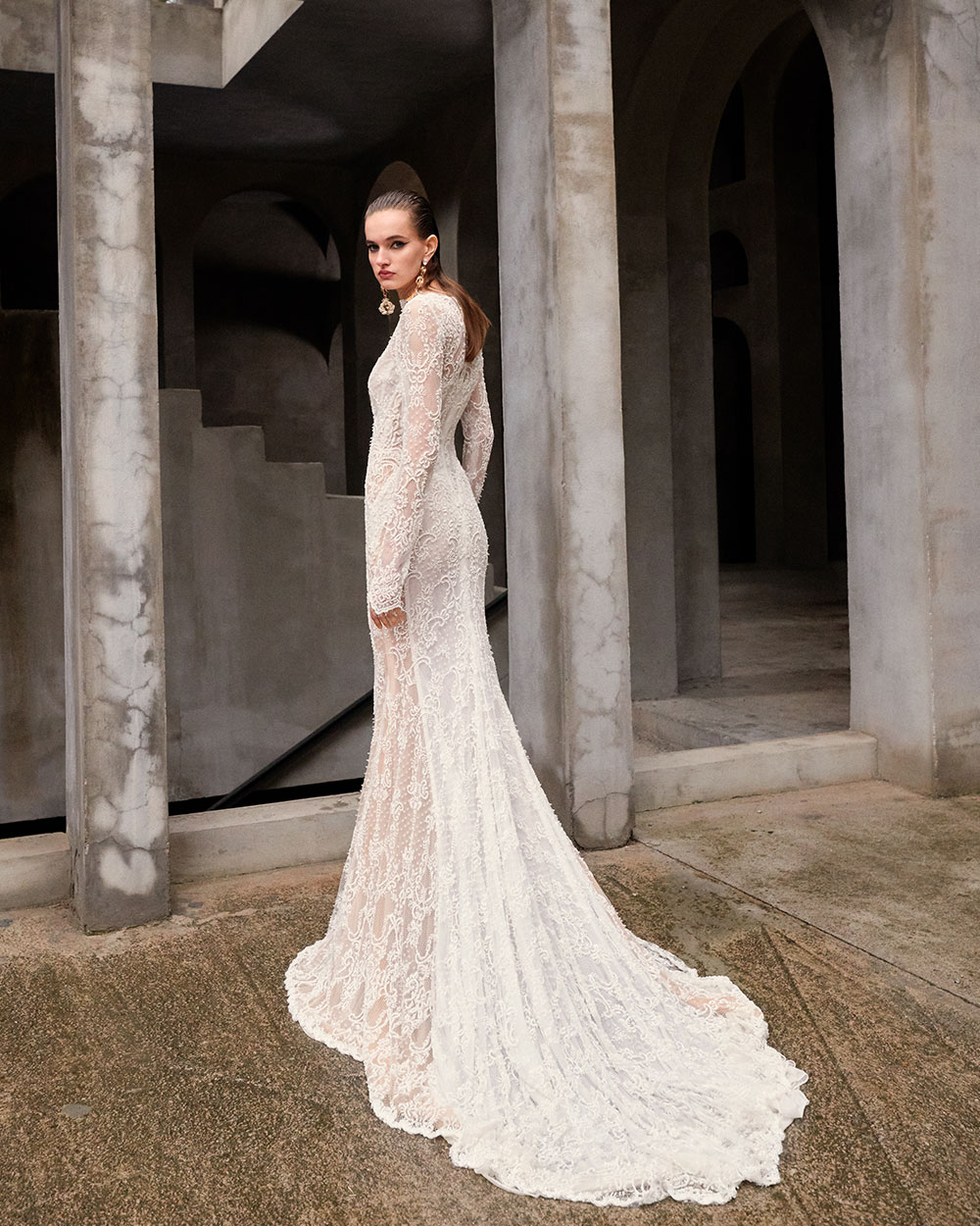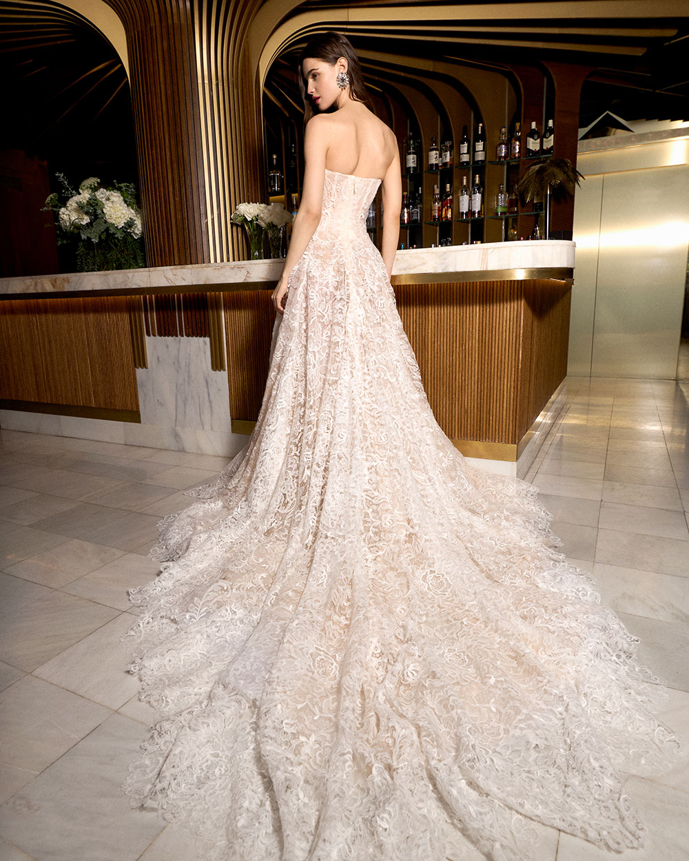上質なファブリックとイリュージョンバックの美しさ、まるでジュエリーを身に纏っているかのような繊細で豪華な刺繍が特徴。